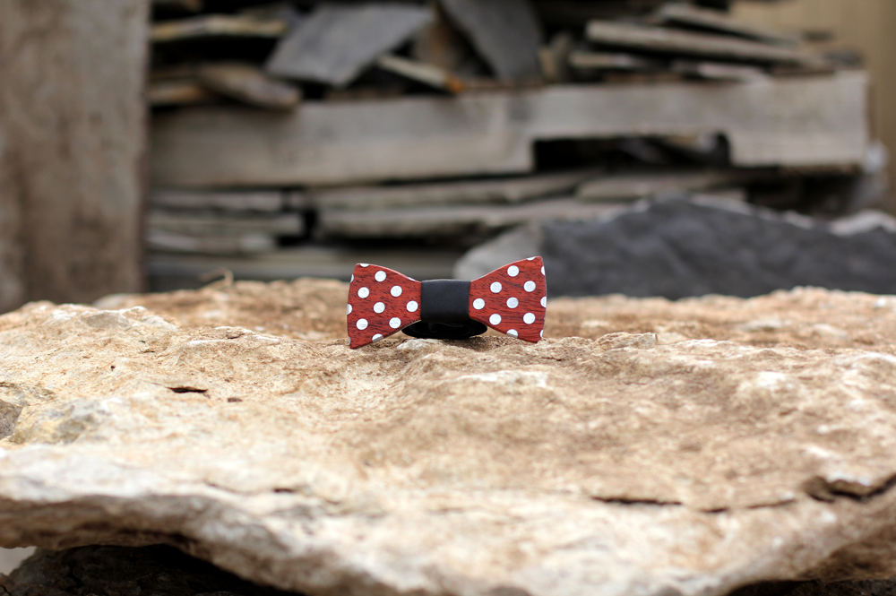 Bright red stripes add brilliance to this handsome shedua wood bow tie. Set on either...
