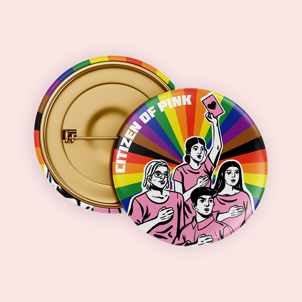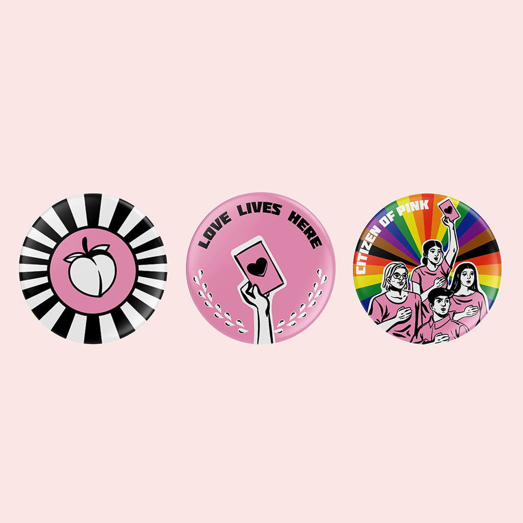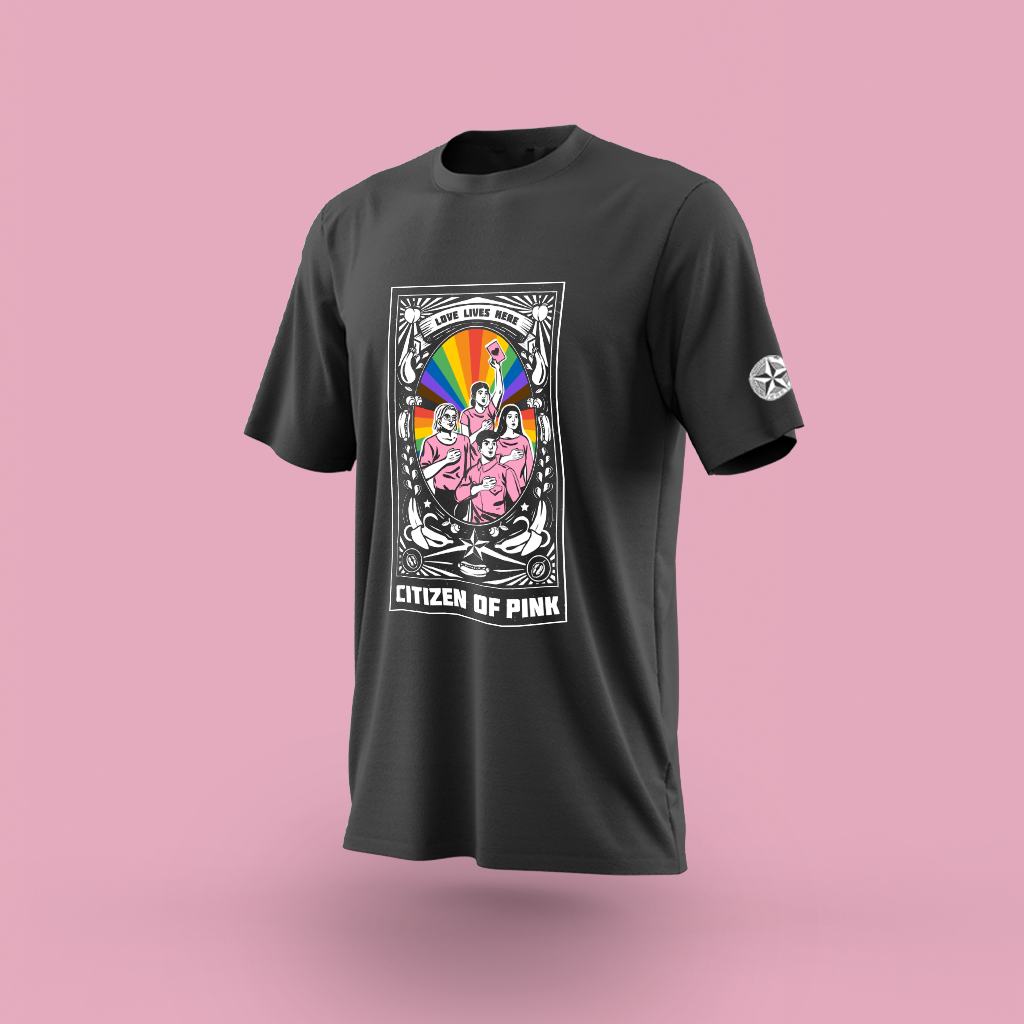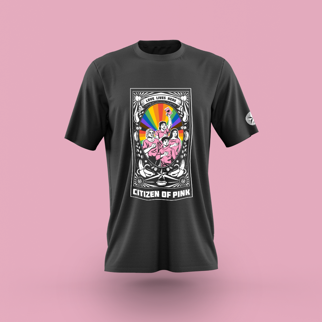 Each t-shirt comes with one of three limited-edition “Citizen of Pink” pins, which you can don any way you like to continue being beacons of love and solidarity for those who cannot.