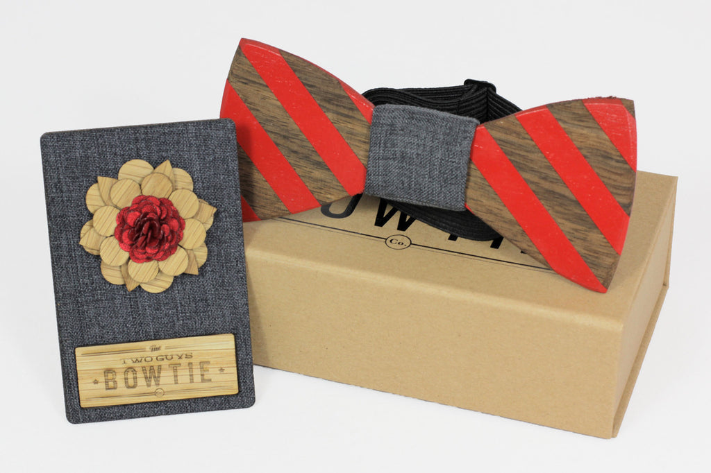 The Calvin wooden bow tie and the Hartford wooden lapel flower compliment each other in a way that is sure to excite. You won't be over looked on your big day with these two statement makers.
